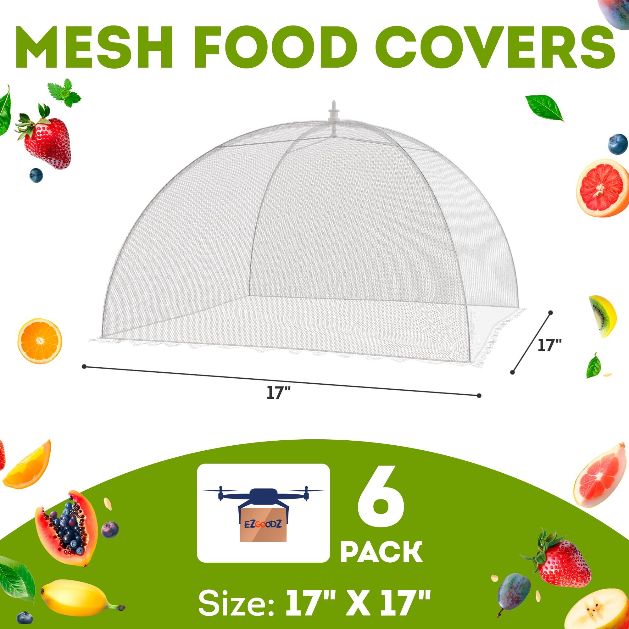 1.PACK OF 6 FOOD NETS FOR OUTDOORS: The 17''x 17'' picnic covers for food are large enough to cover full plates of food up to 8" high and up to 16'' in diameter. With a mesh umbrella food cover, your products will be protected from insects and dust.